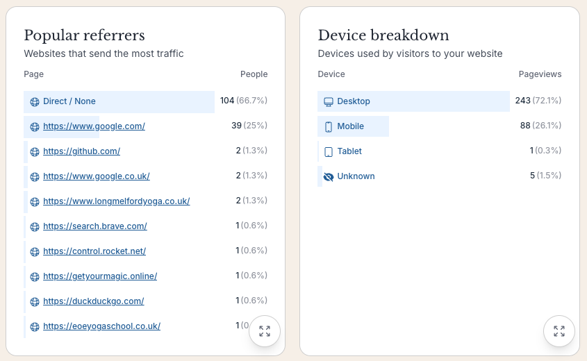 Include top pages, referrers, devices, unique visitors, bounce rates, and more.
